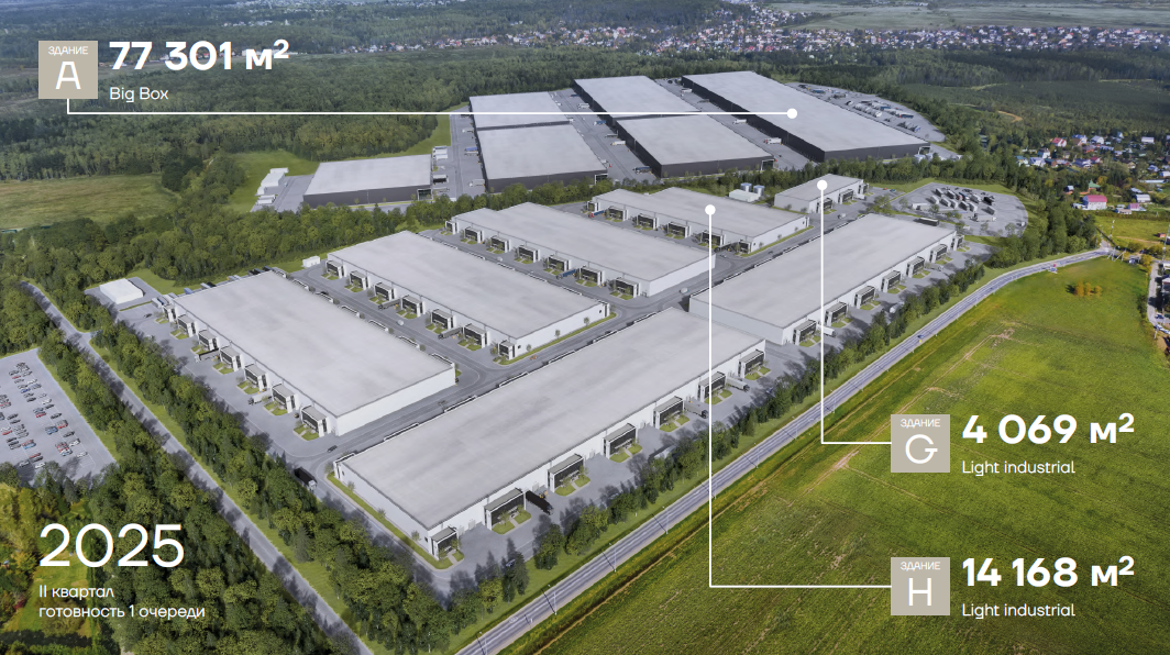 Продается отдельное здание G под пром-склад 4069 м2 . Срок сдачи в эксплуатацию - 2 кв. 2025 г. Так же есть в наличии блоки - складские помещения до 77311 м2.
