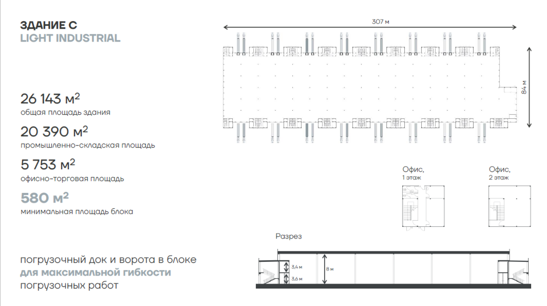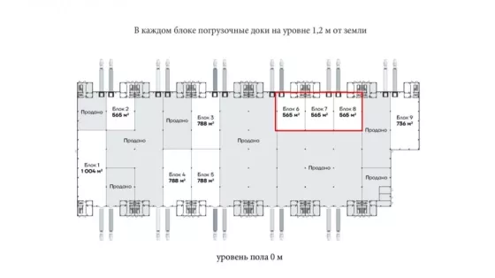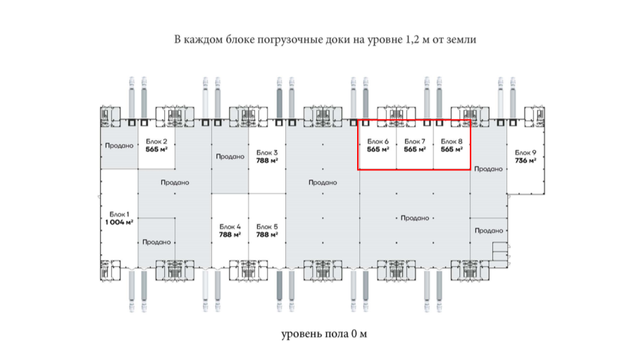 ЗОНА РАЗГРУЗКИ в каждом блоке погрузочные доки на уровне 1,2 м от земли, с докшелтерами и доклевеллерами и/или ворота на уровне земли;