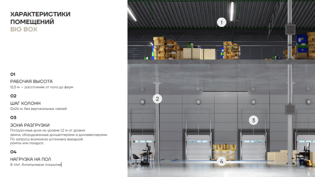 ЗОНА РАЗГРУЗКИ - Погрузочные доки на уровне 1,2 м от уровня земли, оборудованные докшелтерами и доклевеллерами.По запросу возможна установка въездной рампы или пандуса;