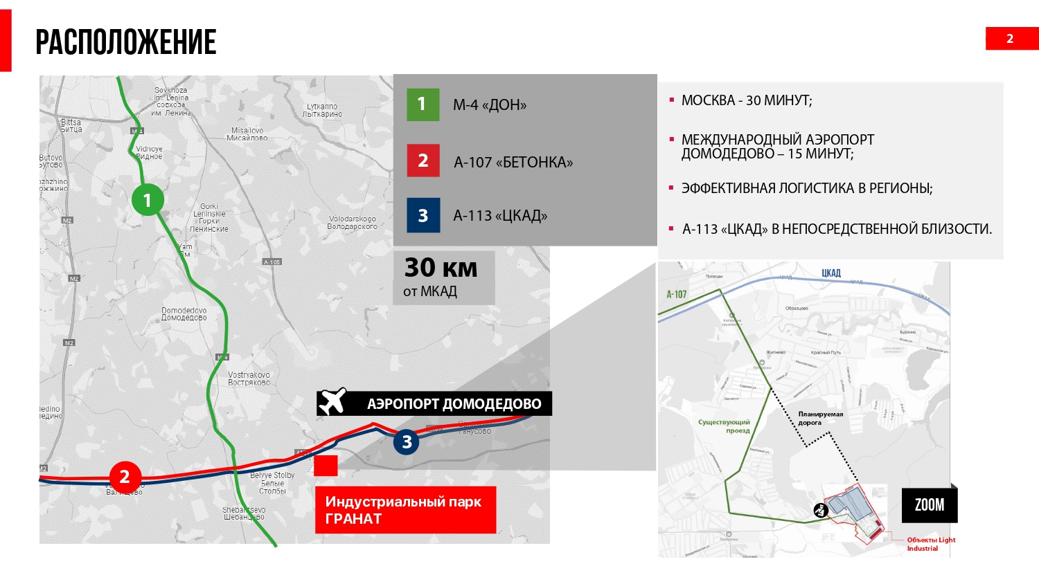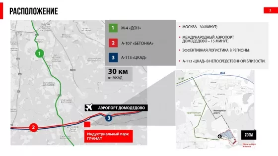 Удобный выезд на ЦКАД, М2 и М4. Расстояние от МКАД - 30км.